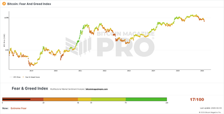 根據Bitcoin Magazine的資料,虛擬資產市場的貪婪恐懼指數(Fear & Greed Index)目前報17,並已多日處於「極度恐懼」區間。歷史經驗顯示,當指數落入恐懼或極度恐懼區間時,往往伴隨價格局部反彈,甚至可能觸發趨勢性反轉。
