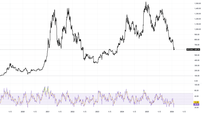 於2025年第四季度,黃金呈現指數型上漲走勢,而比特幣則呈現近似45度角的穩定下降趨勢。此種與歷史模式顯著偏離的表現,在比特幣兌黃金比率(BTC/XAU)上尤為明顯。該比率已回落至2023年6月以來的最低水準。而因黃金近期漲勢過於急劇,導致該比率的相對強弱指數(RSI)曾跌至23.54,進入超賣區間,並創下自新冠疫情以來的最低紀錄。此顯示該比率已大幅偏離歷史均值,具備相當顯著的均值回歸與修復空間。