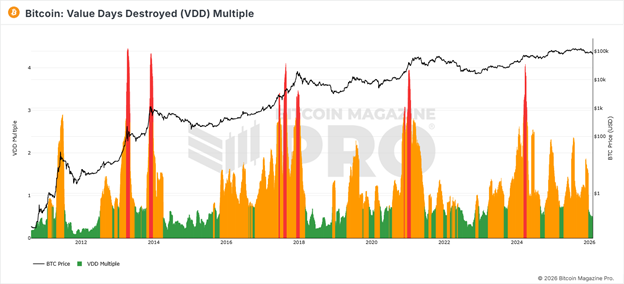 此指標的核心在於量化Coin Days Destroyed乘以比特幣價格後的短期相對變化,指標轉為橙色的階段通常對應長期持有者減少拋售、短期投機者清倉離場,市場籌碼變得扎實穩定的階段,歷史上多次與熊市尾聲或牛市回調底部相吻合,預期VDD表現將與先前底部信號一致。